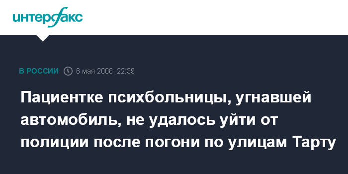 Таллин. 6 мая. ИНТЕРФАКС - В эстонском городе Тарту (Tartu) душевнобольная женщина самовольно покинула психоневрологическую больницу, угнала стоявшую неподалеку машину и совершила несколько аварий, прежде чем ее задержала полиция.