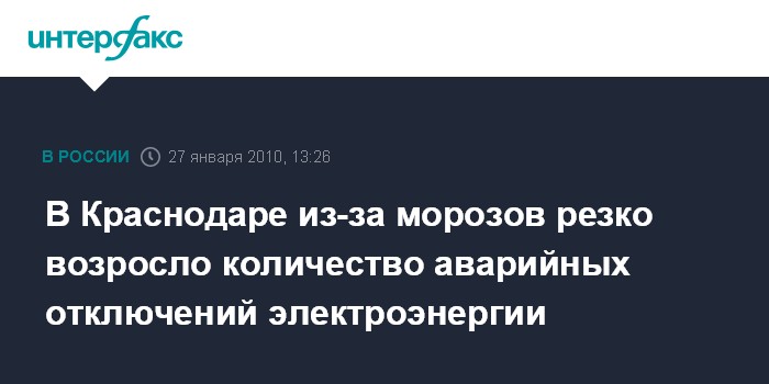 Москва. 27 января. INTERFAX.RU - В Краснодаре две ночи подряд энергетики устраняют аварийные отключения электричества, связанные с увеличением нагрузки на сети из-за морозов свыше 20 градусов.