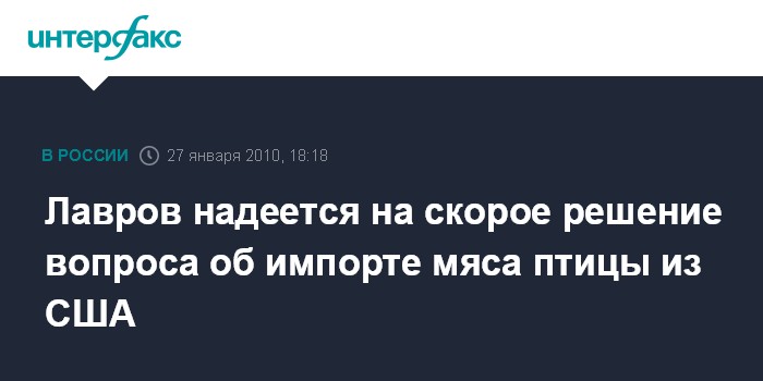 Лондон. 27 января. INTERFAX.RU - В Москве рассчитывают, что проблемы с поставками из США мяса птицы будут урегулирован в скором будущем, заявил глава МИД РФ Сергей Лавров.
