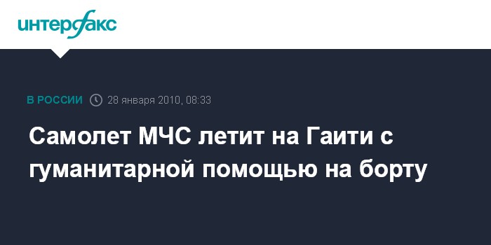 Москва. 28 января. INTERFAX.RU - В 6:15 мск в четверг с аэродрома Раменское вылетел самолет ИЛ-76 МЧС РФ с 15 тоннами гуманитарной помощи для пострадавшего от землетрясения населения Гаити, сообщили в управлении информации МЧС РФ.