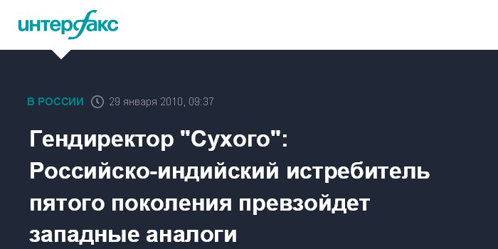 "В планы компании "Сухой" входит дальнейшее развитие программы (истребителя пятого поколения - ИФ), над которой мы будем работать совместно с индийскими партнерами. Я уверен, что наш совместный проект превзойдет западные аналоги по критерию "стоимость-эффективность", - эти слова Погосяна приводятся в сообщении пресс-службы компании "Сухой", поступившем в "Интерфакс-АВН" в пятницу.