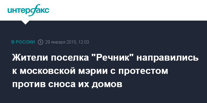 Москва. 28 января. INTERFAX.RU – Жители поселка "Речник" и поддерживающие их активисты начали автопробег от Поклонной горы до московской мэрии в знак протеста против сноса жилья в этом поселке.