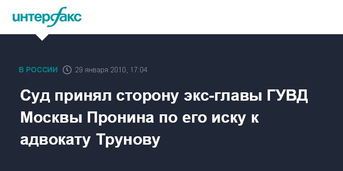 Москва. 29 января. INTERFAX.RU - Савеловский суд Москвы удовлетворил иск бывшего начальника ГУВД столицы Владимира Пронина к адвокату Игорю Трунову в связи с его высказываниями по "делу Евсюкова", передает корреспондент "Интерфакса".
