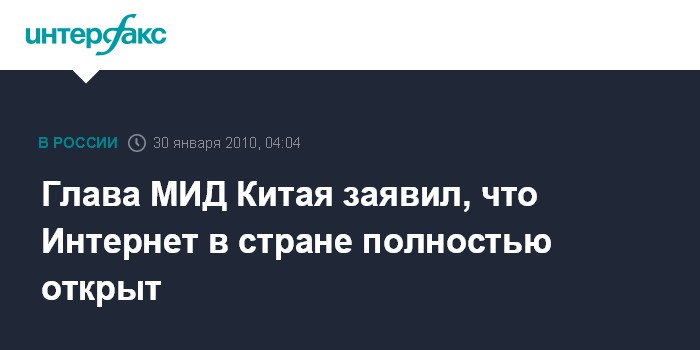 "Интернет в Китае открыт, активно используется. Китайский народ в соответствии с законом пользуется свободой слова, своевременно поучает различного рода информацию. Это также является одной из причин твердого следования Китая по пути социализма с китайской спецификой", - сказал министр в Лондоне на встрече с госсекретарем США Хилари Клинтон.