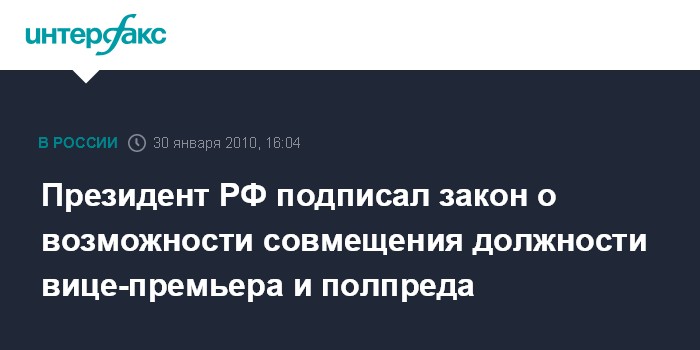 Москва. 30 января. INTERFAX.RU - Президент России Дмитрий Медведев подписал изменение в федеральный закон о государственной гражданской службе, сообщила пресс-служба Кремля. Это изменение, в частности, предполагает, что в соответствии с указами президента РФ вице-премьеры и федеральные министры могут одновременно занимать должности полномочных представителей президента в федеральных округах. Ранее А.Хлопонин, до недавнего времени занимавший пост губернатора Красноярского края, был назначен вице-премьером и одновременно полпредом главы государства в Северо-Кавказском федеральном округе.