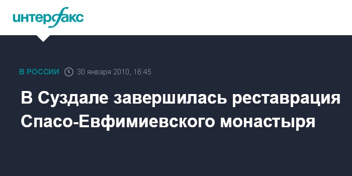 Суздаль. 30 января. INTERFAX.RU - В Суздале Владимирской области завершена длившаяся шесть лет глобальная реставрация музейного комплекса "Спасо-Евфимиевский монастырь", сообщается на официальном сайте Владимиро-Суздальского музея-заповедника. Общая стоимость реставрационных работ превысила 360 млн рублей, большая часть из которых поступила по федеральной адресной инвестиционной программе "Культура России". На эти средства удалось восстановить обрушившуюся в 2003 году верхнюю часть монастырской стены, укрепить берега реки Каменки, на которой стоит монастырь, чтобы предотвратить оползни, отреставрировать и реконструировать все монастырские стены и башни, восстановив боевые ходы в них, выполнить обмазку стен. Теперь посетители монастыря могут совершить увлекательную экскурсию по боевым ходам монастырских стен.