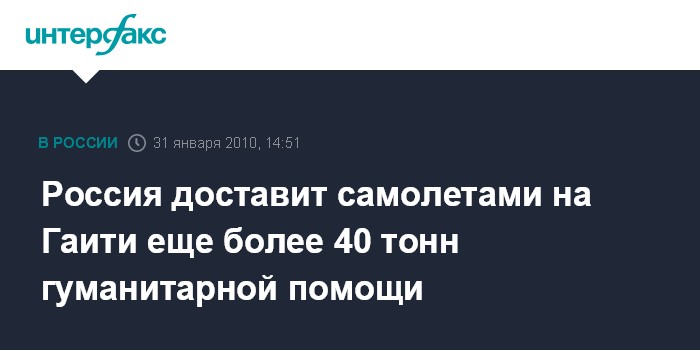 Москва. 31 января. INTERFAX.RU - Россия в ближайшие несколько дней отправит на Гаити еще два самолета МЧС с гуманитарной помощью.