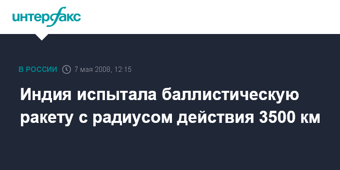 Дели. 7 мая. INTERFAX.RU - Индия провела успешное испытание баллистической ракеты, способной нести как конвенциональный, так и ядерный заряд на расстояние до 3000-3500 км, сообщило министерство обороны страны.