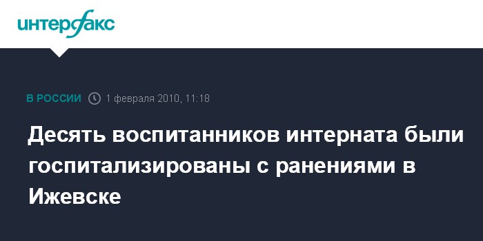 Москва. 1 февраля.INTERFAX.RU – В Ижевске выясняют обстоятельства инцидента в школе-интернате N2, десять воспитанников которого были госпитализированы с резаными ранами рук.