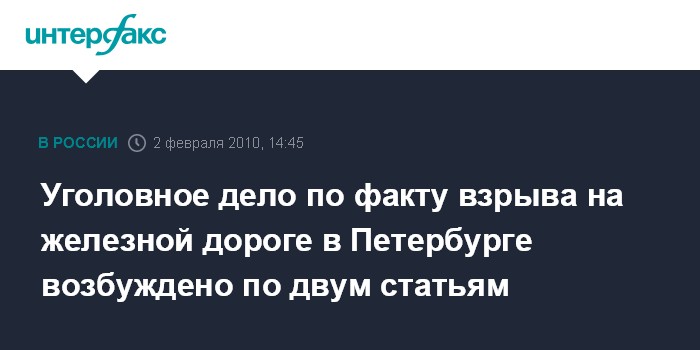 Москва. 2 февраля. INTERFAX.RU – Уголовное дело по факту взрыва на железнодорожном полотне в Петербурге в ночь на вторник возбуждено по двум статьям, сообщил "Интерфаксу" источник в правоохранительных органах города. Дело находится в производстве по статьям "незаконное хранение боеприпасов" (222 УК РФ) и "терроризм" (205 УК РФ).