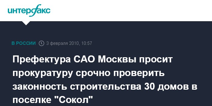 Префектура САО Москвы просит прокуратуру срочно проверить законность строительства 30 домов в поселке "Сокол"