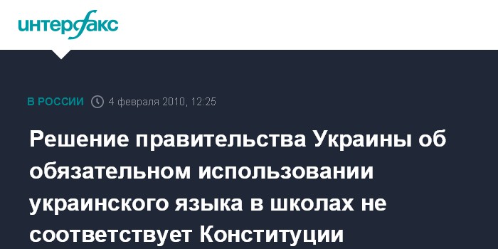 Москва. 4 февраля. INTERFAX.RU - Кабинет министров Украины вышел за пределы своих полномочий, обязав педагогов общеобразовательных учебных учреждений государственной и коммунальной формы собственности в рабочее время постоянно применять украинский язык.