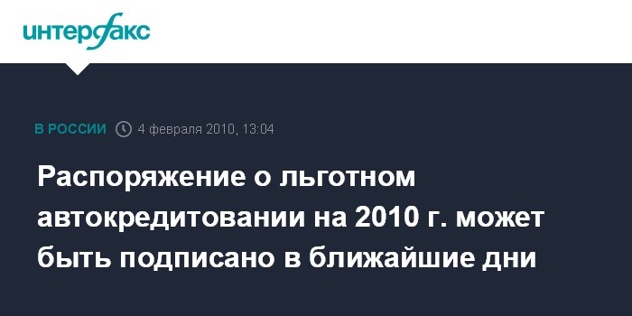 Москва. 4 февраля. INTERFAX.RU – Распоряжение о льготном автокредитовании на 2010 год может быть подписано в течение ближайших дней, сообщил в четверг журналистам замглавы министерства промышленности и торговли РФ Андрей Дементьев.