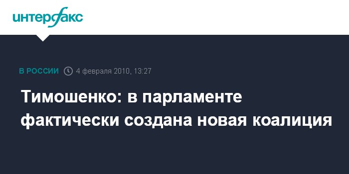 Москва. 4 февраля. INTERFAX.RU - В Верховной Раде фактически создана новая коалиция из фракций Партии регионов, "Наша Украина - Народная самооборона" и Коммунистической партии, заявила кандидат на пост президента, премьер-министр Юлия Тимошенко. "Я думаю, что вчера уже по существу вырисовалась коалиция - Партия регионов, коммунисты и "Наша Украина". Я думаю, что эта коалиция как раз и сделала свой первый успешный шаг, разрушив честные выборы президента и, по сути, поставив под угрозу демократический путь развития страны", - сказала она на пресс-конференции в Киеве в четверг.