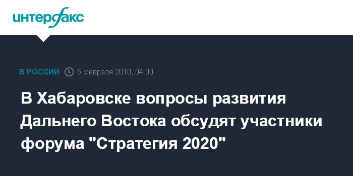 Хабаровск. 5 февраля. ИНТЕРФАКС - ДАЛЬНИЙ ВОСТОК - Форум "Стратегия 2020", призванный поднять актуальные вопросы развития территории Хабаровского края при участии экспертного сообщества, представителей власти и деловых кругов, пройдет в Хабаровске в пятницу.