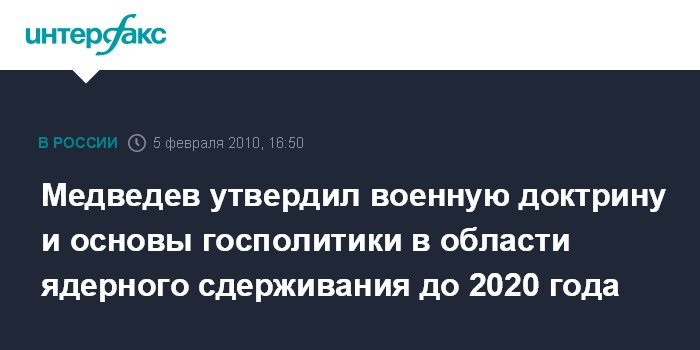 Медведев утвердил военную доктрину и основы госполитики в области ядерного сдерживания до 2020 года