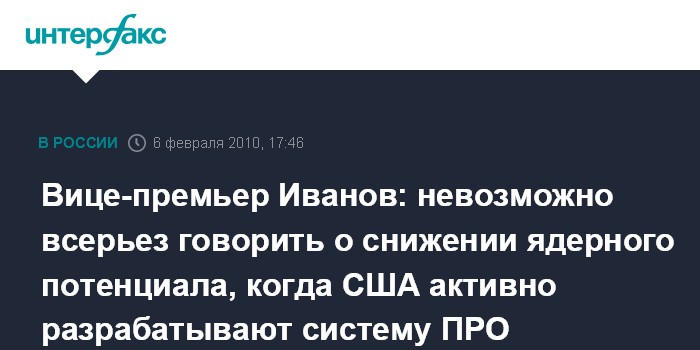 "Невозможно всерьез говорить о снижении ядерного потенциала, когда государство, обладающее ядерным оружием, разрабатывает и размещает системы защиты от средств доставки ядерных зарядов, которые есть у других государств. Это подобно теории щита и меча, когда и то и другое постоянно развивается, держа в уме характеристики и возможности каждого из них", - сказал С.Иванов, выступая в субботу на 46-ой Мюнхенской конференции по безопасности.
