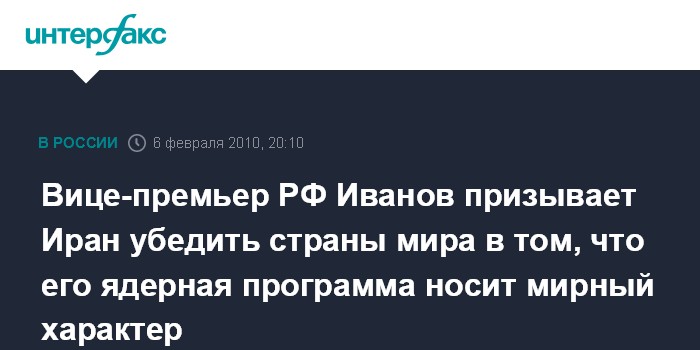 Вице-премьер РФ Иванов призывает Иран убедить страны мира в том, что его ядерная программа носит мирный характер