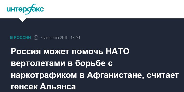 Россия могла бы помочь НАТО в Афганистане предоставлением вертолетов, поставками и обеспечением запчастей, подготовкой пилотов, обучением афганских вооруженных сил и полиции, борьбой с контрабандой наркотиков, пояснил генсек Альянса. Речь идет, прежде всего, о "вертолетном пакете", добавил он.