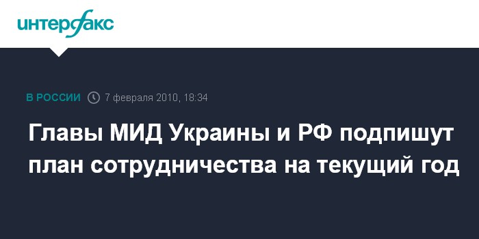 Киев. 7 февраля. INTERFAX.RU - Министры иностранных дел Украины и России договорились на следующей неделе подписать план сотрудничества между внешнеполитическими ведомствами двух стран на 2010 год. Как сообщает в воскресенье сайт МИД Украины, об этом глава украинского ведомства Петр Порошенко и его российский коллега Сергей Лавров договорились в ходе встречи 6 февраля в Мюнхене ("на полях" международной конференции по вопросам политики безопасности - ИФ).