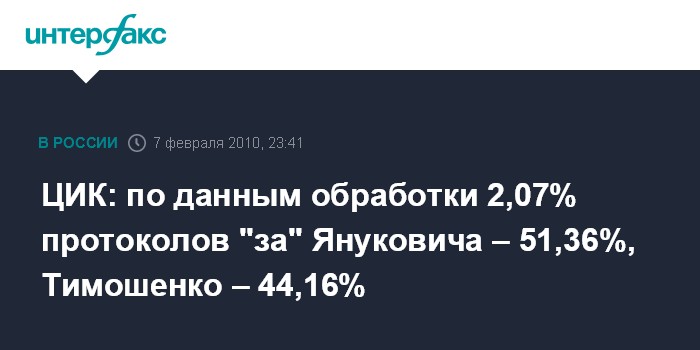 Киев. 7 февраля. INTERFAX.RU - По данным обработки 2,07% протоколов за Виктора Януковича проголосовали 51,36%, за Юлию Тимошенко 44,16%, не поддержали ни одного кандидата 3,43%.