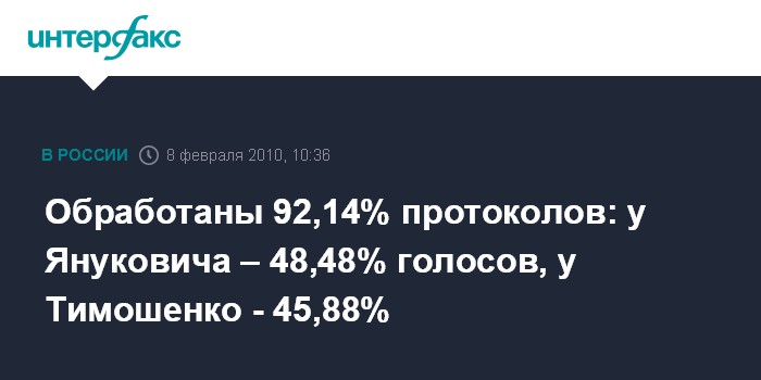 Киев. 8 февраля. INTERFAX.RU - По данным обработки 92,14% протоколов участковых избирательных комиссий, за Виктора Януковича на президентских выборах проголосовали 48,48%, за Юлию Тимошенко - 45,88%.