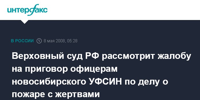 Москва. 8 мая. ИНТЕРФАКС - Верховный суд РФ в четверг рассмотрит жалобу защиты четверых руководителей Новосибирского областного Управления федеральной службы исполнения наказаний (УФСИН), осужденных по делу о пожаре в здании ГУИН (в настоящее время УФСИН) по Новосибирской области в марте 2004 года, в результате которого погибли шесть офицеров управления.