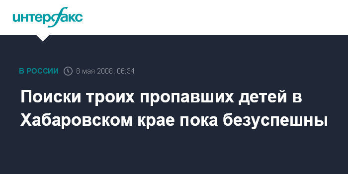 Хабаровск. 8 мая. ИНТЕРФАКС-ДАЛЬНИЙ ВОСТОК - Спасателям, сотрудниками милиции и местным жителям пока не удается найти троих мальчиков, пропавших 29 апреля из поселка Ягодный Комсомольского района Хабаровского края.