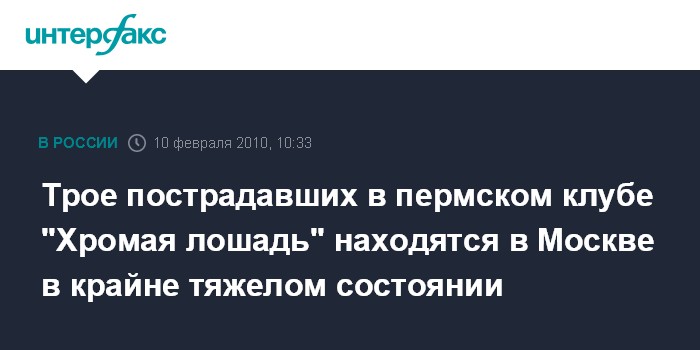 Москва. 10 февраля. INTERFAX.RU – Московские медики продолжают бороться за жизнь трех человек, получивших сильные ожоги в пермском ночном клубе "Хромая лошадь", сообщил "Интерфаксу" в среду источник в медицинских кругах столицы.