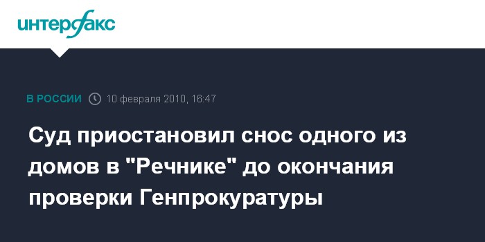 Москва. 10 февраля. INTERFAX.RU - Кунцевский суд приостановил решение о сносе одного из домов на территории поселка "Речник". "Согласно определению Кунцевского суда, исполнительное производство, возбужденное на основании исполнительного листа Кунцевского суда от 6 сентября прошлого года об освобождении Владимиром Виноградовым построек на самовольно занятом им земельном участке, приостановлено", - сообщила журналистам в среду пресс-секретарь Мосгорсуда Анна Усачева. Она добавила, что приостановка решения о сносе продлится до окончания проверки, которую проводит Генпрокуратура РФ.