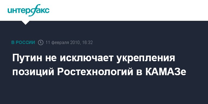 Москва. 11 февраля. INTERFAX.RU - Премьер-министр РФ Владимир Путин не исключает, что в ближайшее время "Ростехнологии" увеличат свою долю в ОАО "КАМАЗ". "Мы не исключаем того, что и государство в виде "Ростехнологий" в ближайшее время может укрепить свои позиции в компании КАМАЗ. Не исключаю, что будет увеличен пакет "Ростехнологий" - мы эту возможность рассмотрим в самое ближайшее время", - заявил премьер, который в четверг посетил центр автоспорта "КамАЗ-Мастер".