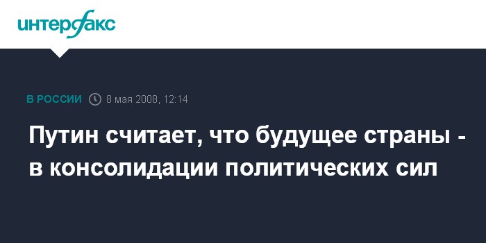 Москва. 8 мая. INTERFAX.RU - Кандидат на пост премьер-министра России Владимир Путин считает, что для развития России необходима консолидация политических сил и солидарность общества.