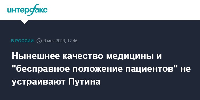 "Нас не могут устраивать сегодняшний уровень доступности и качества медицинской помощи, а также сохраняющееся бесправное положение пациентов", - отметил Путин, выступая сегодня в Госдуме.