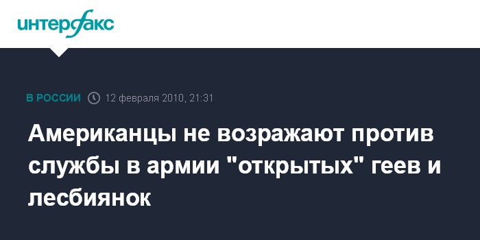 Вашингтон. 12 февраля. INTERFAX.RU - Примерно три четверти американцев поддерживают предложение о приеме на службу в армию гомосексуалистов, которые не скрывают своей сексуальной ориентации, говорится в опросе, результаты которого публикует в пятницу газета Washington Post.