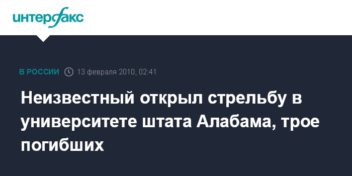 Лондон. 13 февраля. ИНТЕРФАКС - По меньшей мере три человека погибли и еще один ранен в результате стрельбы в университете американского штата Алабама, сообщает в субботу утром британская телерадиовещательная корпорация Би-би-си со ссылкой на журналистские источники в США.
