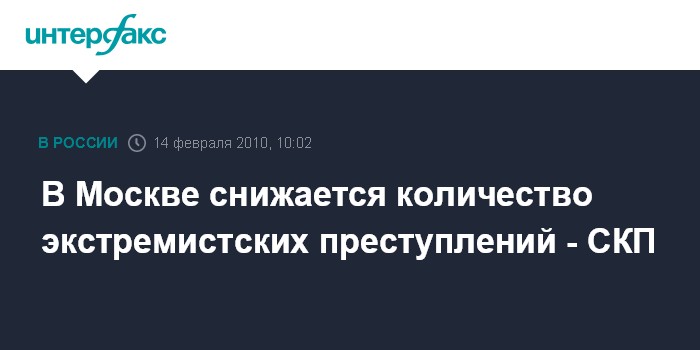 Москва. 14 февраля. INTERFAX.RU - Число преступлений экстремистской направленности в Москве пошло на убыль, заявил "Интерфаксу" глава следственного управления СКП РФ по Москве Анатолий Багмет. "В целом можно констатировать, что в 2009 году произошло общее снижение практически на 25% преступлений, совершенных по экстремистским мотивам, и это, безусловно, положительная динамика", - отметил он.
