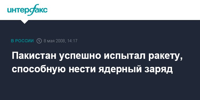 Москва. 8 мая. INTERFAX.RU - Успешное испытание крылатой ракеты "Хатф-VIII", которая может нести ядерный заряд, проведены сегодня в Пакистане. Как сообщает генеральный штаб пакистанской армии, дальность этой пакистанской ракеты воздушного базирования составляет 350 километров.