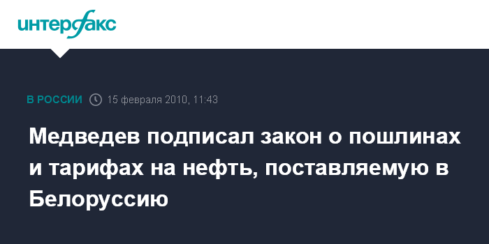 Москва. 15 февраля. INTERFAX.RU - Президент России Дмитрий Медведев подписал закон о ратификации изменений, внесенных в российско-белорусское торговое соглашение в части пошлин на нефть, сообщила пресс-служба главы государства.