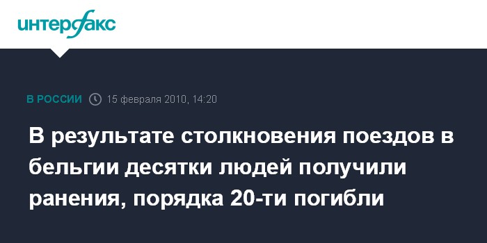 Брюссель. 15 февраля. INTERFAX.RU - Столкновение двух пассажирских поездов произошло в понедельник утром близ Брюсселя, сообщает бельгийское телевидение. По предварительным данным полиции, объявленным через 2 часа после аварии, погибло не менее десятка человек. Местные источники говорят о двух десятках. Представитель железной дороги Ан Вуанье сказала о "десятках тяжело раненых".
