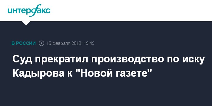 Москва. 15 февраля. INTERFAX.RU - Басманный суд Москвы прекратил производство по иску о защите чести и достоинства президента Чечни Рамзана Кадырова к "Новой газете". Как сообщила "Интерфаксу" в понедельник руководитель пресс-службы Мосгорсуда Анна УсачеваСуд вынес определение о прекращении производства по делу в связи с отказом истца от заявления.