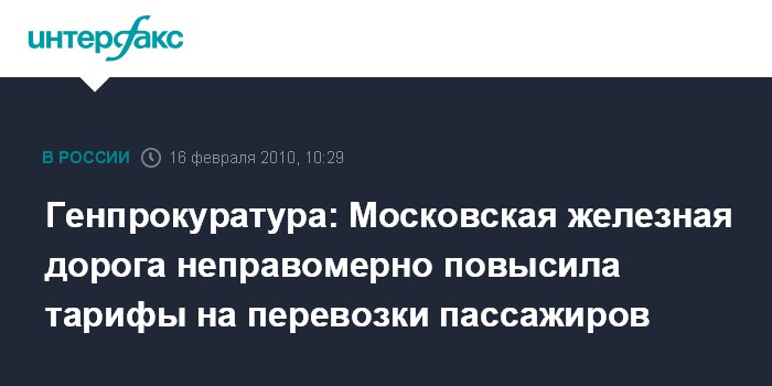 Москва. 16 февраля. INTERFAX.RU – Генеральная прокуратура РФ накануне внесла представление в адрес ОАО "РЖД" и мэра Москвы Юрия Лужкова в связи с необоснованным повышением тарифов на перевозки пассажиров в пригородных поездах.