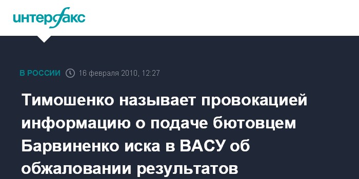 Москва. 16 февраля. INTERFAX.RU – Премьер-министр Украины Юлия Тимошенко, принимавшая участие в президентских выборах в качестве кандидата, называет провокацией информацию о подаче народным депутатом от БЮТ Виталия Барвиненко иска в Высший административный суд Украины об обжаловании результатов президентских выборов.