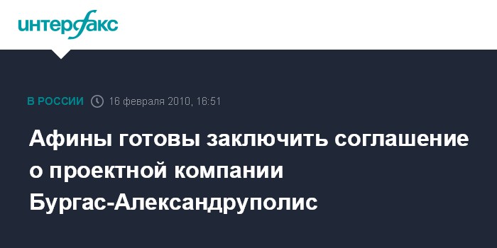 Лондон. 16 февраля. INTERFAX.RU - Греция готова к подписанию соглашения о проектной компании нефтепровода Бургас-Александруполис, сообщил журналистам премьер-министр Греции Георгиос Папандреу по итогам встречи с премьер-министром РФ Владимиром Путиным в Москве.