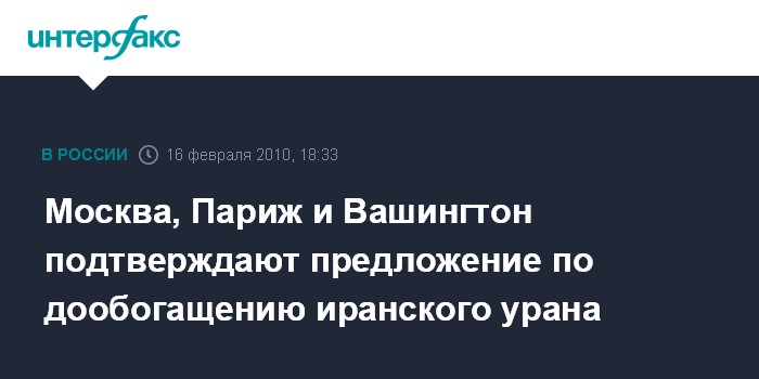 Москва. 16 февраля. INTERFAX.RU - Россия, Франция и США направили в МАГАТЭ официальное письмо, в котором подтверждается предложение дообогащать иранский уран за рубежом по уже предложенной схеме, заявил замглавы МИД РФ Сергей Рябков.