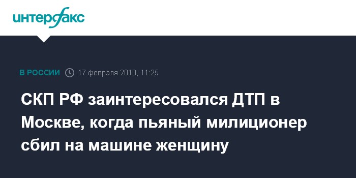 Москва. 17 февраля. INTERFAX.RU – Следственный комитет при прокуратуре истребовал материалы по факту ДТП, в котором пьяный водитель в форме милиционера сбил женщину, стоявшую на тротуаре.