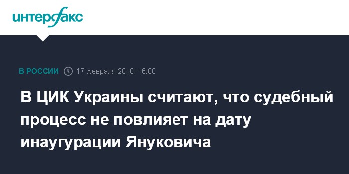 Киев. 17 февраля. INTERFAX.RU - Заместитель председателя Центральной избирательной комиссии Украины Андрей Магера уверен, что судебный процесс не повлияет на проведение инаугурации нового президента, которая назначена на 25 февраля.