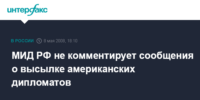 Москва. 8 мая. INTERFAX.RU - В департаменте информации и печати МИД РФ не комментируют сообщения некоторых СМИ о высылке из России двух сотрудников военного атташата посольства США. "Мы воздерживаемся от любых комментариев", - сказали "Интерфаксу" в четверг представители ведомства.