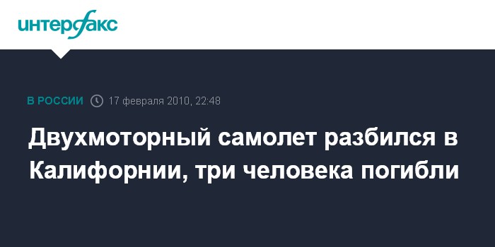 Вашингтон. 17 февраля. ИНТЕРФАКС - Небольшой двухмоторный самолет типа "Сессна-310" разбился в среду в городке Ист Пало-Альто близ города Сан-Хосе (штат Калифорния, США), три человека, находившиеся на борту, погибли, сообщает интернет-сайт американской газеты "Лос-Анджелес таймс".