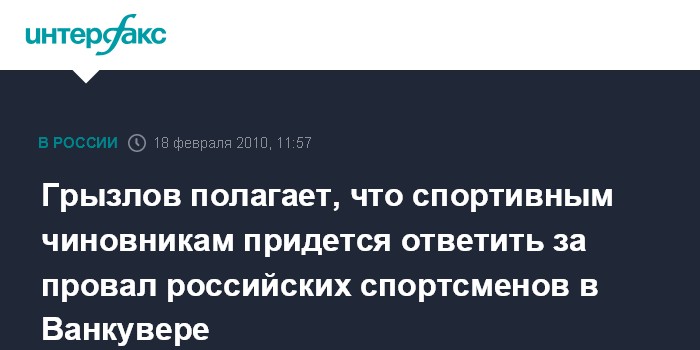 Москва. 18 февраля. INTERFAX.RU – Председатель Госдумы Борис Грызлов заявил, что будет считать провалом, если на зимней Олимпиаде в Ванкувере российская команда займет место ниже четвертого, и не исключил, что спортивные чиновники понесут за это ответственность.