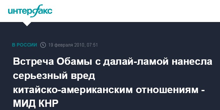 Встреча Б.Обамы с далай-ламой состоялась в четверг в Белом доме. Китай неоднократно предупреждал, что такая встреча приведет к дальнейшему ухудшению отношений между двумя странами, особенно после решения США о поставках Тайваню крупной партии современных вооружений.
